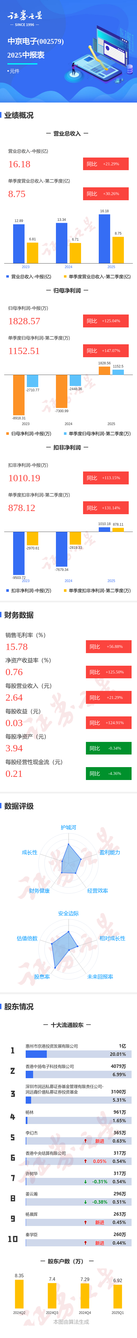 证券之星消息,中京电子2025年中报显示,公司主营收入16.18亿元,同比上升21.29%;归母净利润1828.57万元,同比上升125.05%;扣非净利润1010.19万元,同比上升113.15%;其中2025年第二季度,公司单季度主营收入8.75亿元,同比上升30.26%;单季度归母净利润1152.51万元,同比上升147.07%;单季度扣非净利润878.12万元,同比上升131.15%;负债率59.67%,投资收益-348.55万元,财务费用3889.29万元,毛利率15.78%。